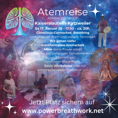 Außerdem findet für alle bisherigen Teilnehmerinnen und Teilnehmer des PowerBreathWork-Basis-Workshops, am 17. Januar wieder eine Atemreise statt.